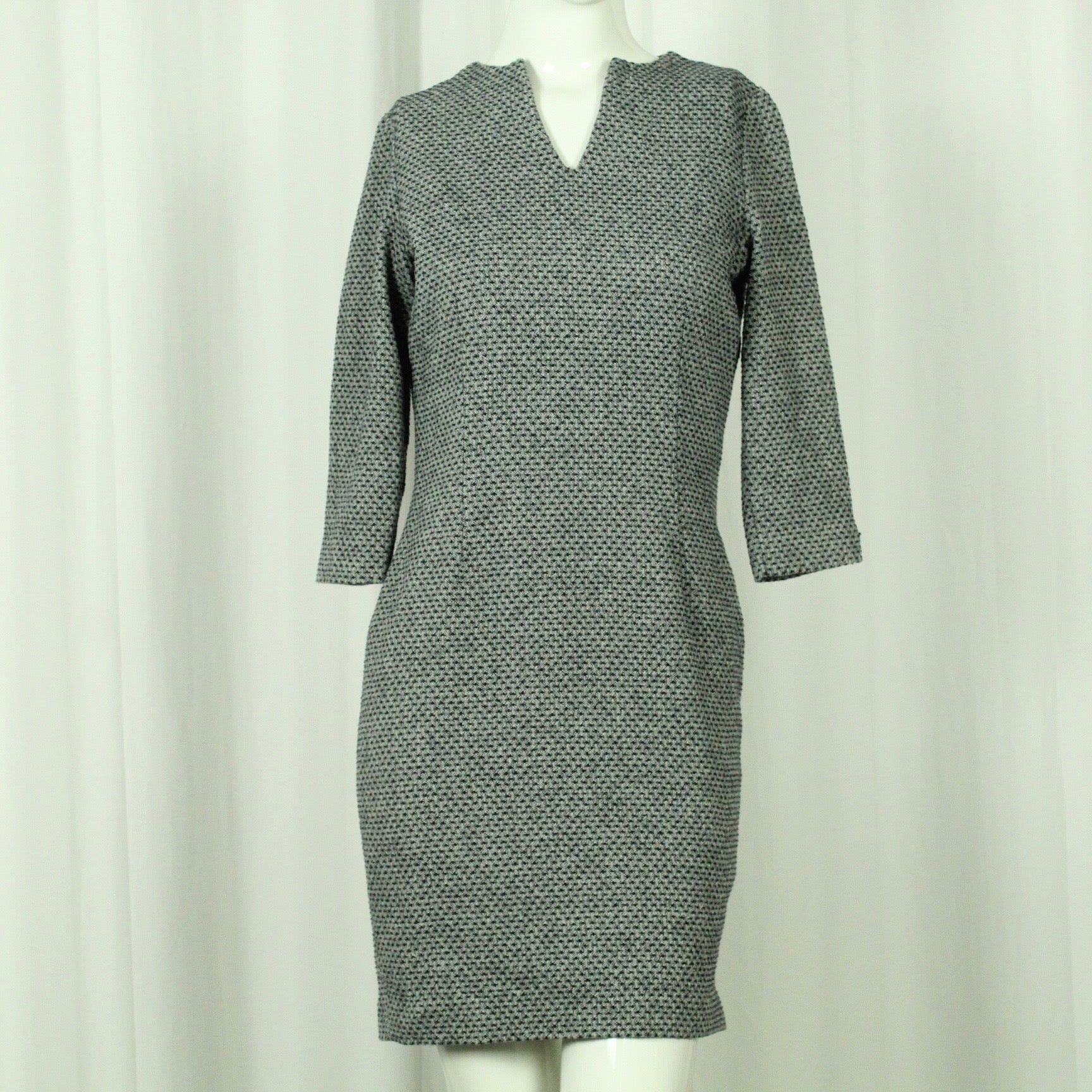 Details: weiß, schwarz, gemustert, 3/4 Arm, V-Ausschnitt, Reißverschluss am Rücken, Wolle