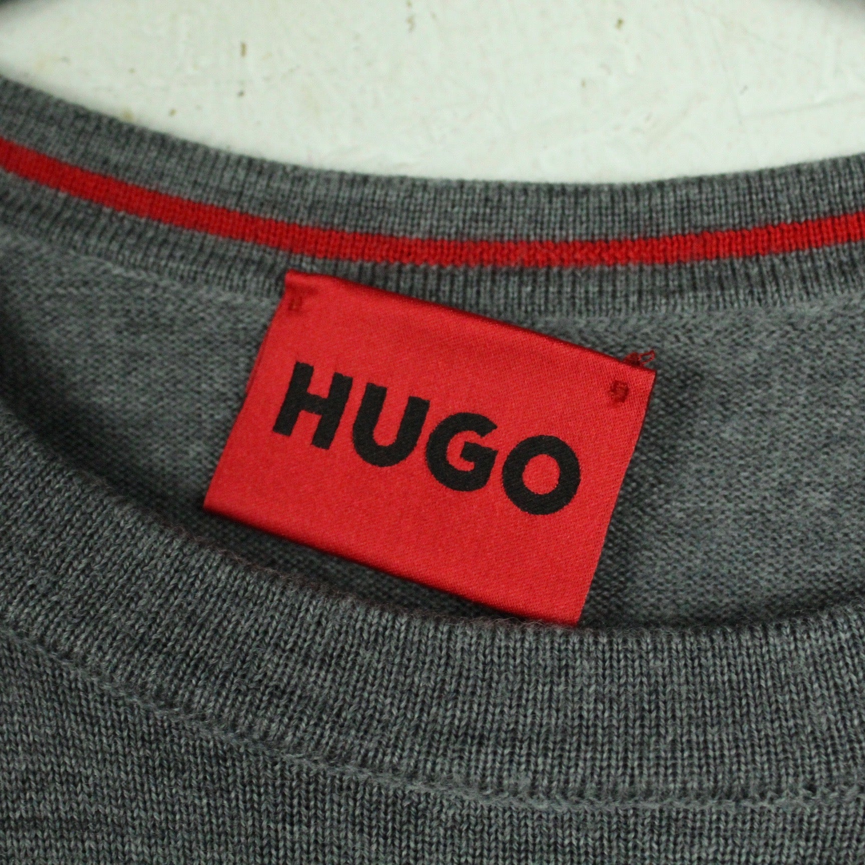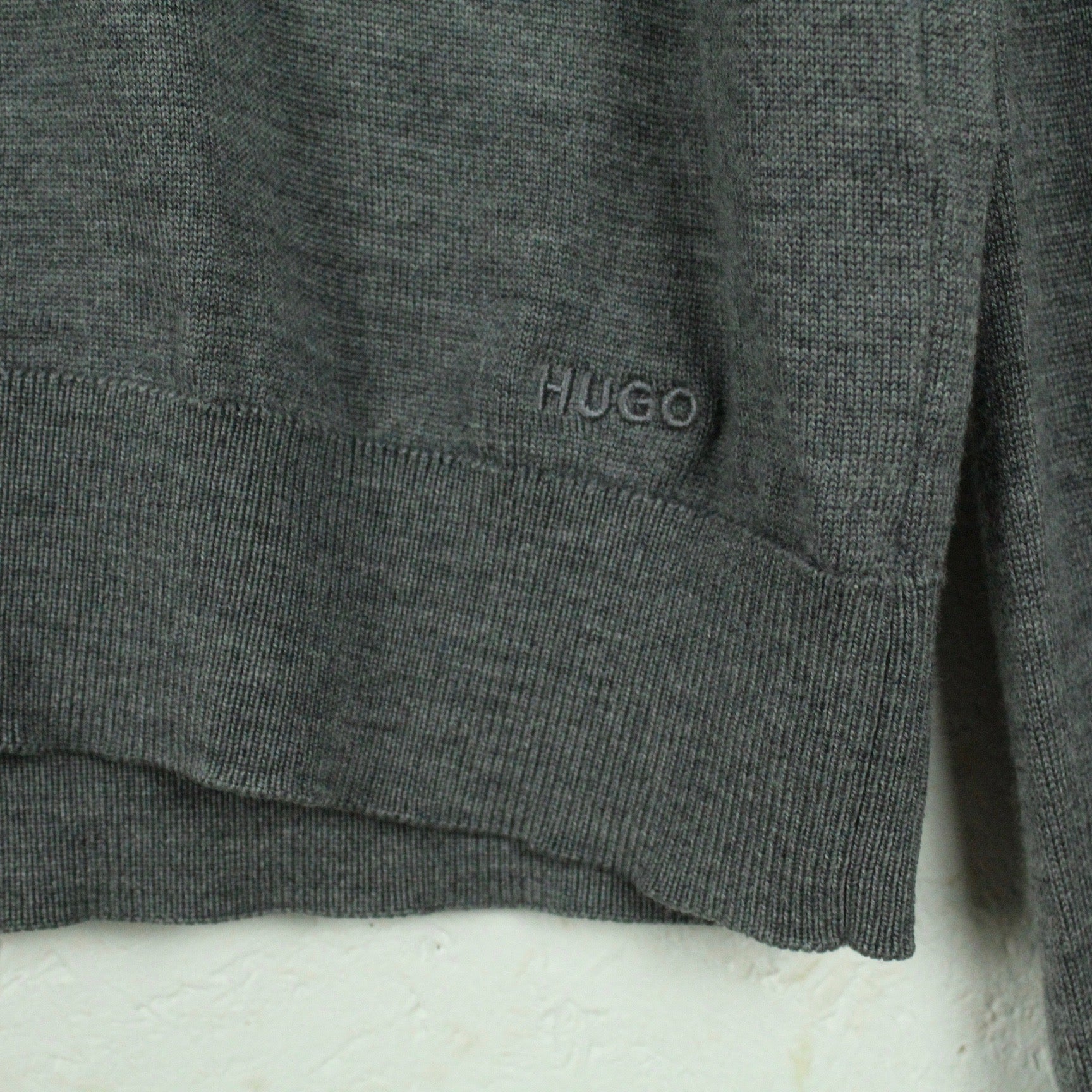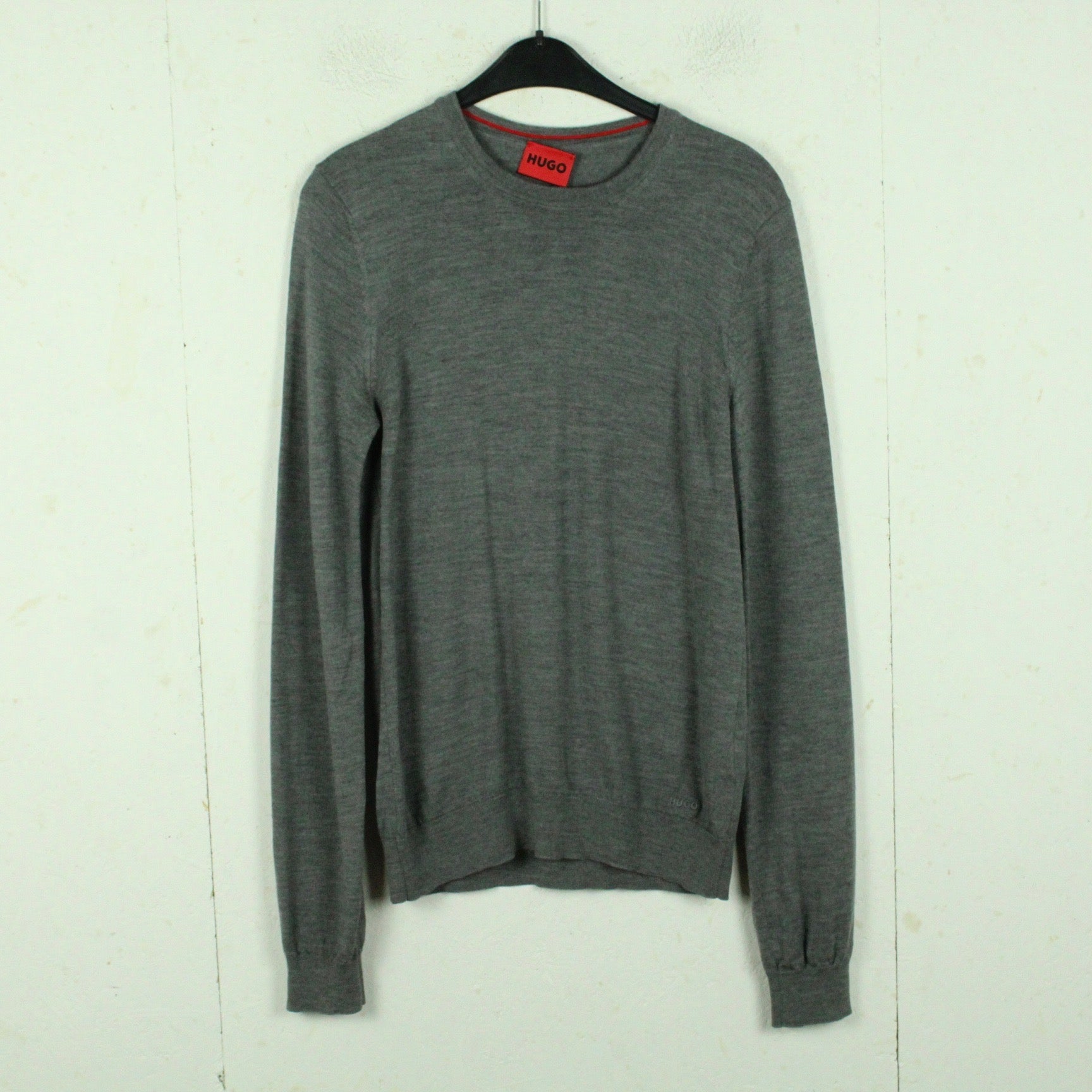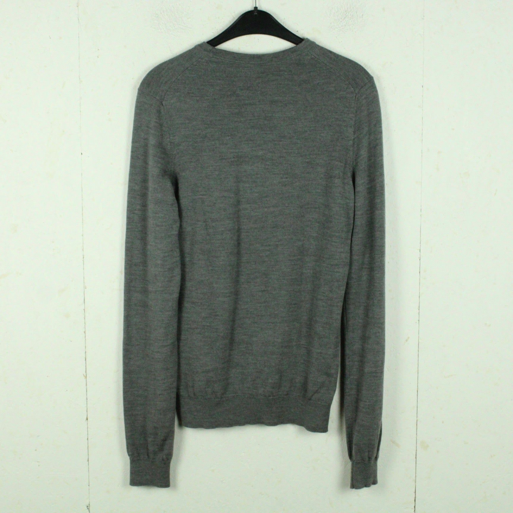 Details: grau meliert, langarm, rundhals, klassische Passform, Wolle