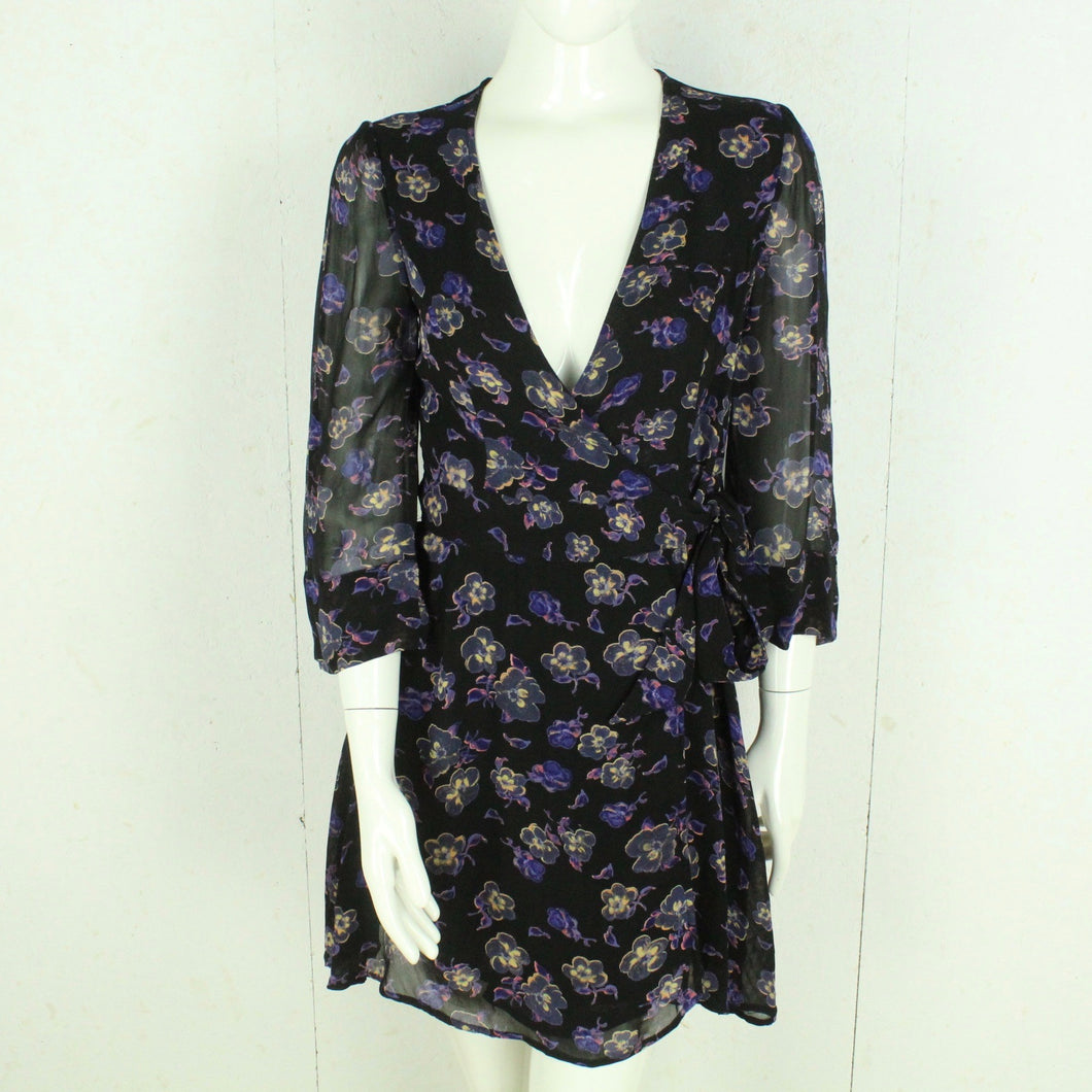 Details: schwarz, mehrfarbig, geblümt, 3/4 Arm, V-Ausschnitt, Wickelkleid